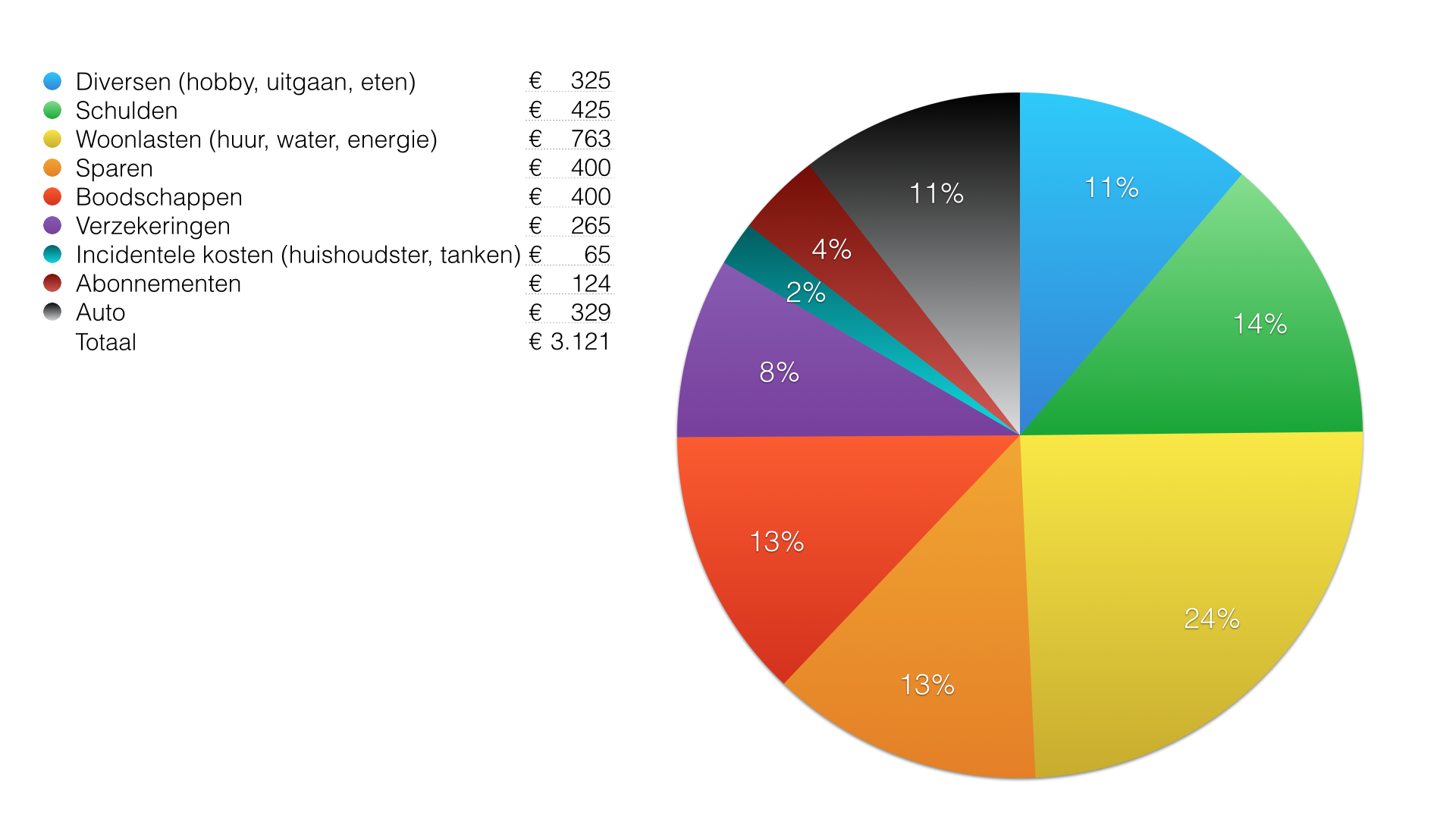 Mijn inkomen bedraagt meer dan €3.250 netto per maand, maar ik denk dat €3.250 afgerond voor mij een goed bedrag is om mee te rekenen als ik als eenverdiener comfortabel wil leven. Mijn totale uitgaven over een willekeurige maand bedragen ongeveer €3.121, dit is inclusief sparen. Hieronder zie je een schijfdiagram met de maandelijkse uitgaven, ingedeeld in categorieën, als een percentage van mijn maandinkomen, met de daadwerkelijke getallen in Euro’s erbij.
