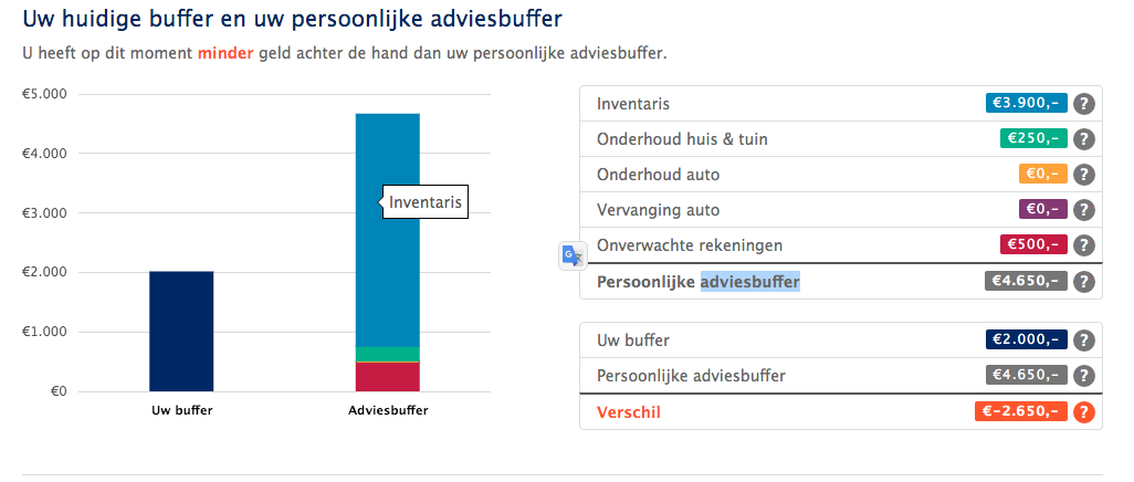Je vult in de BufferBerekenaar gegevens in over je gezinssituatie, je inkomen, je eigen buffer, je woning en je auto en je krijgt de uitslag te zien. Ik heb voor mijn buffer €2.000 ingevuld, het bedrag dat ik op dit moment op mijn spaarrekening heb staan. De crypto’s heb ik even buiten beschouwing gelaten. Ik kom uit op een tekort van €2.650, voor een adviesbuffer van €4.650.