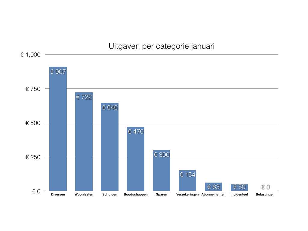 Ik heb in januari €1.377 uitgegeven in deze categorieën. Dat is meer dan één derde van mijn salaris. Dat is een hoop geld. Laten we eens meer in detail kijken waar dit geld aan uitgegeven is.