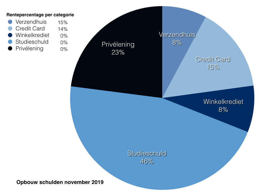 Als ik mijn schulden in categorieën indeel, waarbij ik kijk naar welk rente percentage bij welke categorie hoort, dan zie ik dat het aandeel van rentedragende schulden gelukkig slechts 23% van mijn totale schulden bedraagt. Het verzendhuiskrediet heeft de hoogste rente met 15%, maar is slechts 8% van de totale schuld. De credit card schuld heeft een rente van 14%, en is 15% van de totale schuld.