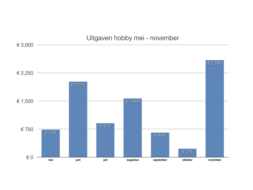 Dit komt omdat ik, zoals gezegd, over de loop van deze maanden bijgeleend heb om bepaalde aanschaffen voor mijn hobby te kunnen bekostigen. Daar zaten een paar duurdere items tussen, die ik deels door een winkelkrediet en deels door een privélening gefinancierd heb. Beide kosten me niets extra, omdat ik geen rente hoef te betalen, maar het is natuurlijk wel een extra bedrag om terug te betalen. De duurste maanden waren juni, augustus en november, met uitgaven van respectievelijk €2.015, €1.569 en €2.590.